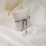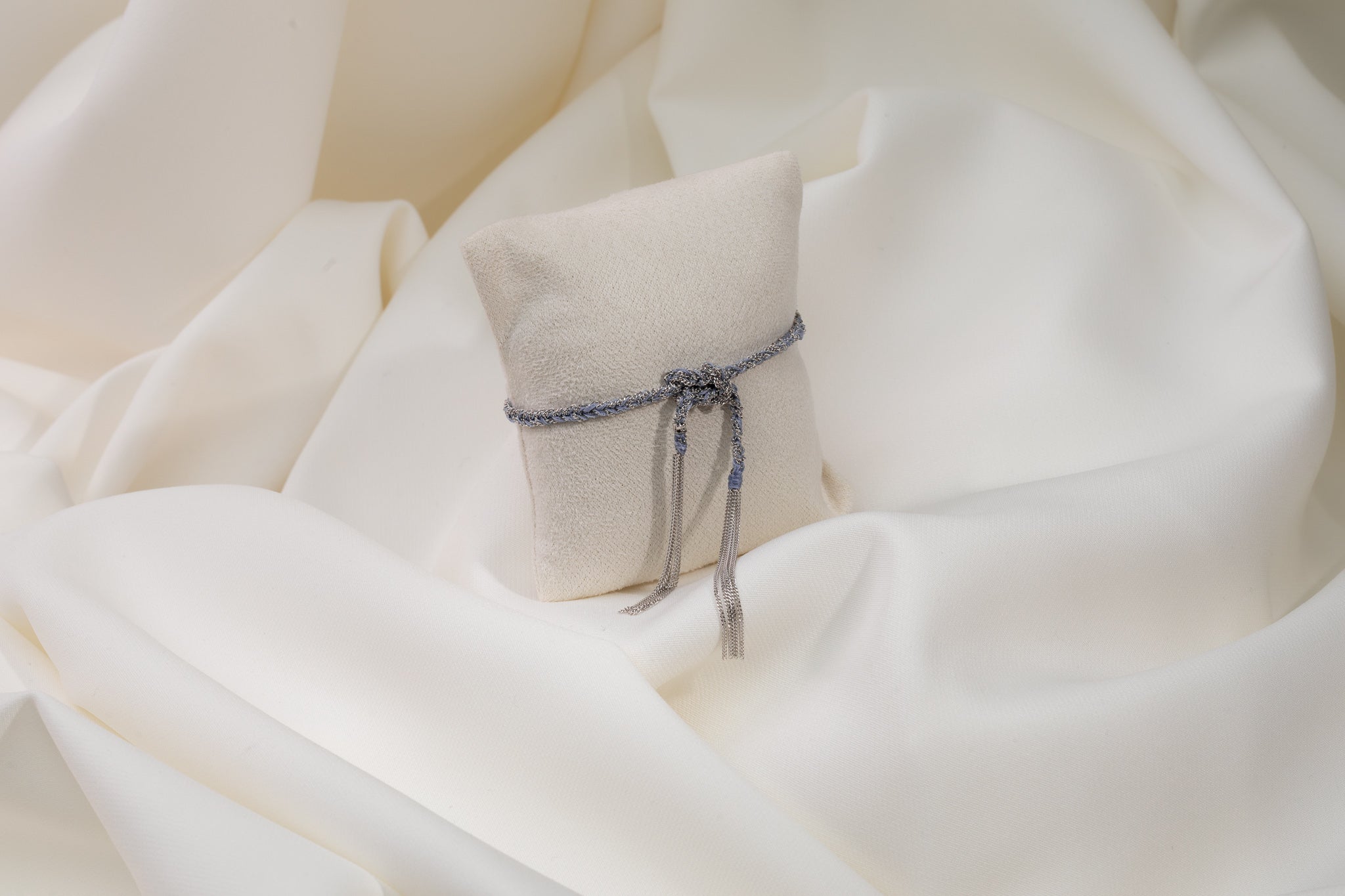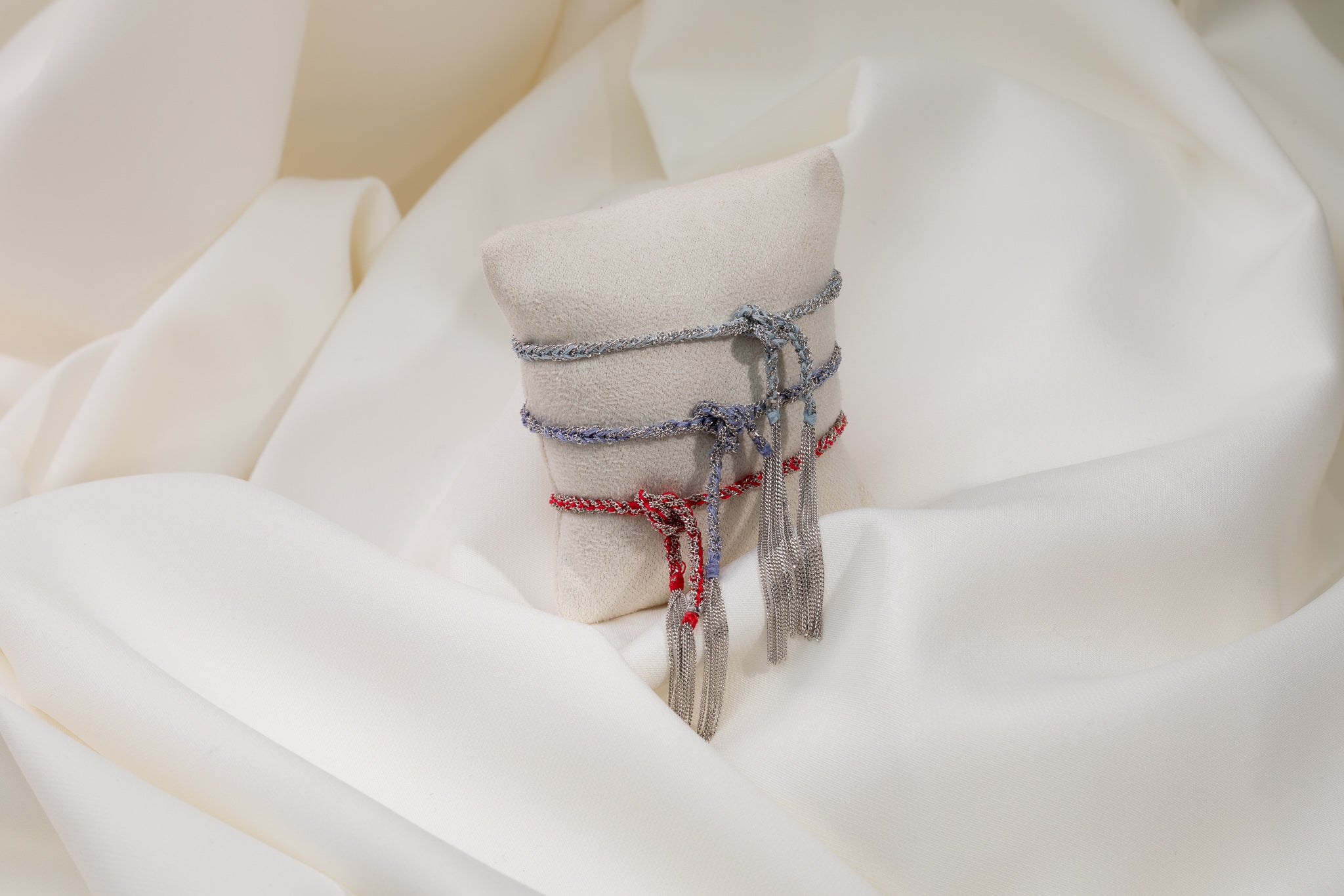 The braided bracelet made of silver and silk, combines the lustrous elegance of silver with the soft and luxurious texture of silk. The bracelet features delicate strands of silver interwined with vibrant silk threads, creating a harmonious contrast of materials.