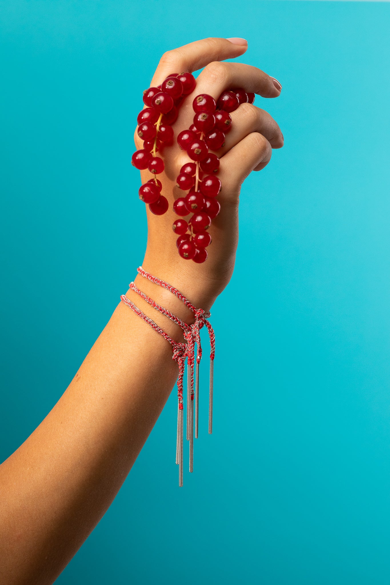The braided bracelet made of silver and silk, combines the lustrous elegance of silver with the soft and luxurious texture of silk. The bracelet features delicate strands of silver interwined with vibrant silk threads, creating a harmonious contrast of materials.